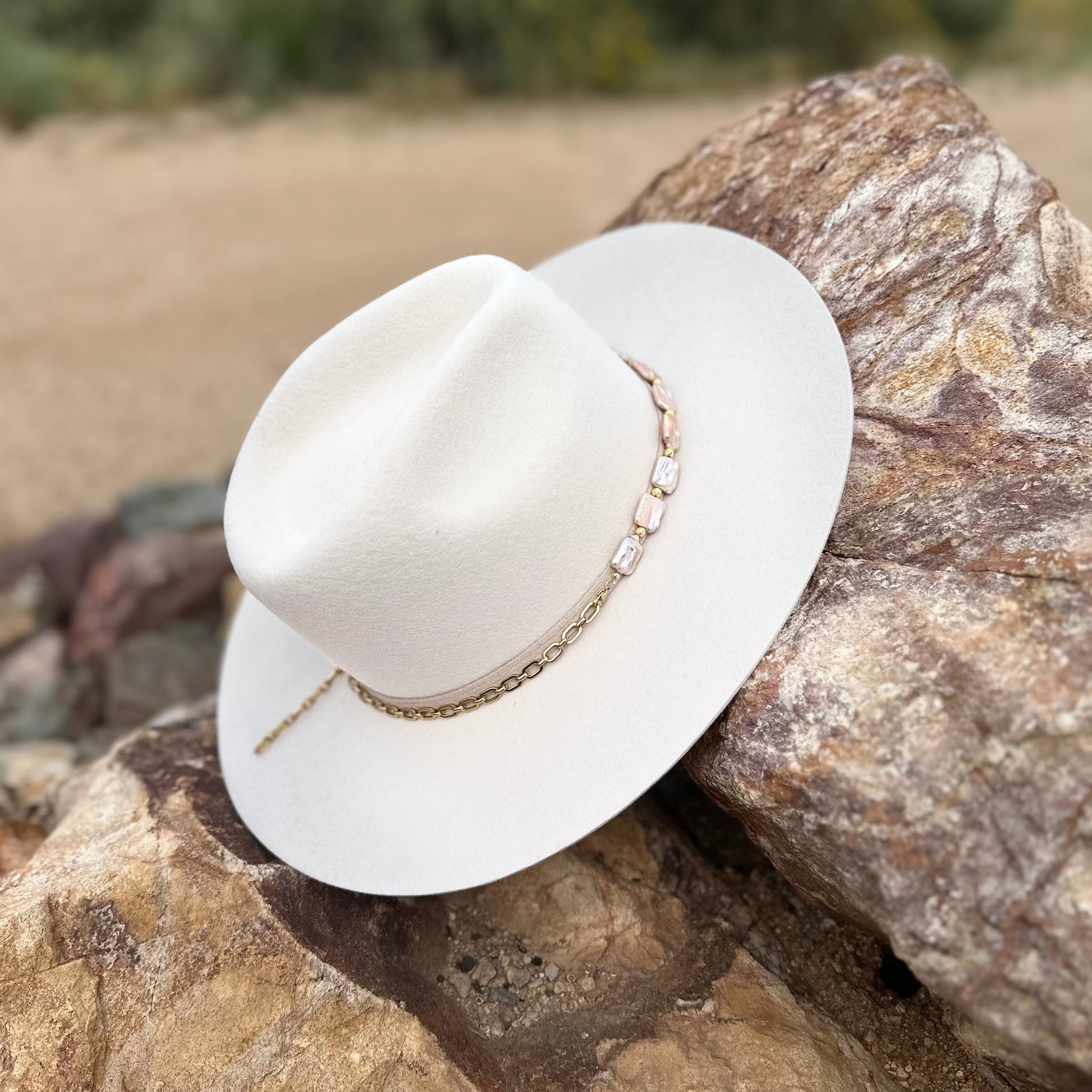 Finished with an adjustable gold chain, the band is fully removable and designed to fit most hat sizes, making it easy to switch between your favorite hats — doubles as a necklace.