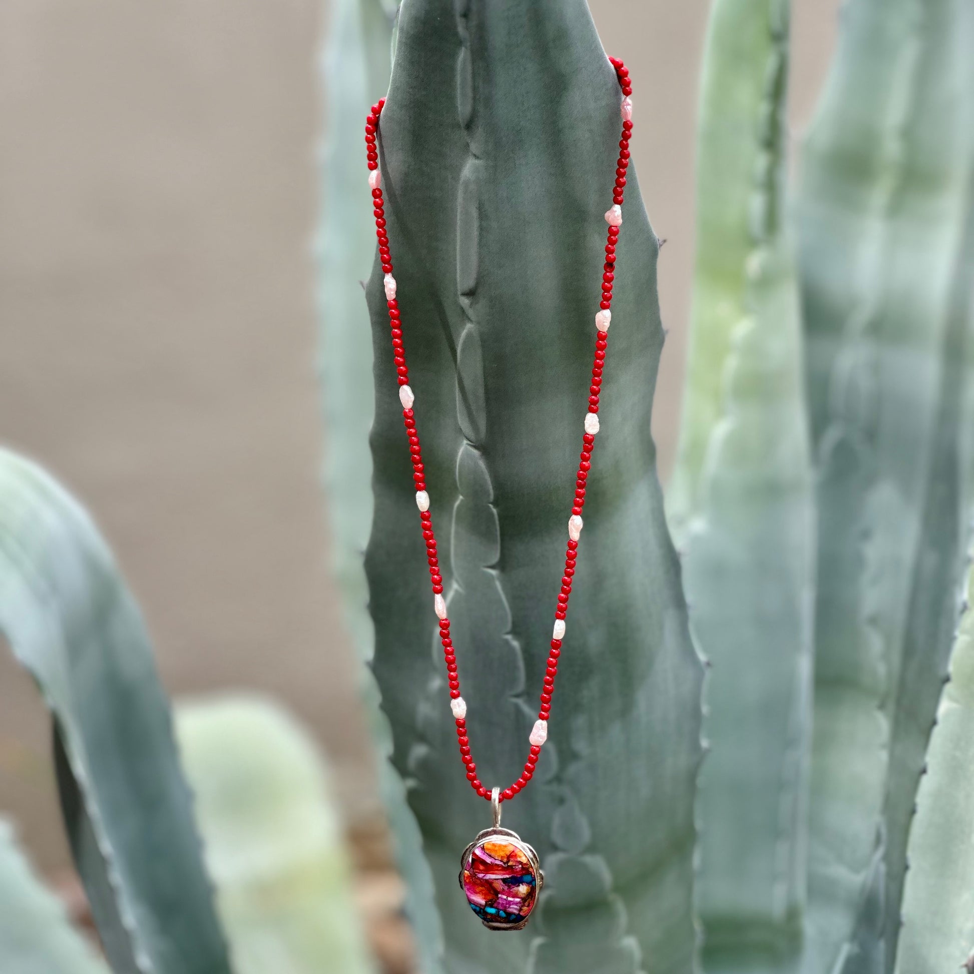 This Pink Spiny Oyster Oval Pendant Necklace features a unique composite of oyster shell, copper and turquoise, capturing the raw beauty of the Southwest in a bold, one-of-a-kind design.